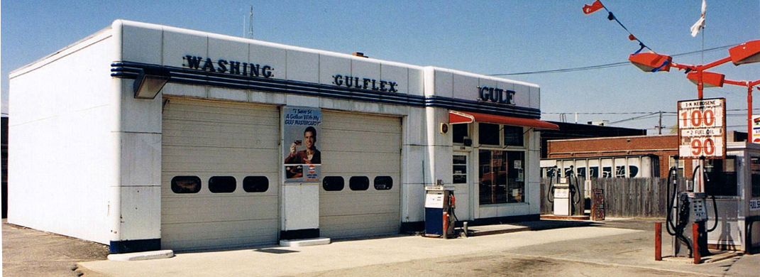 The original Gulf station was remodeled in 1953 with porcelain enamel panels on the exterior to look like an icebox.